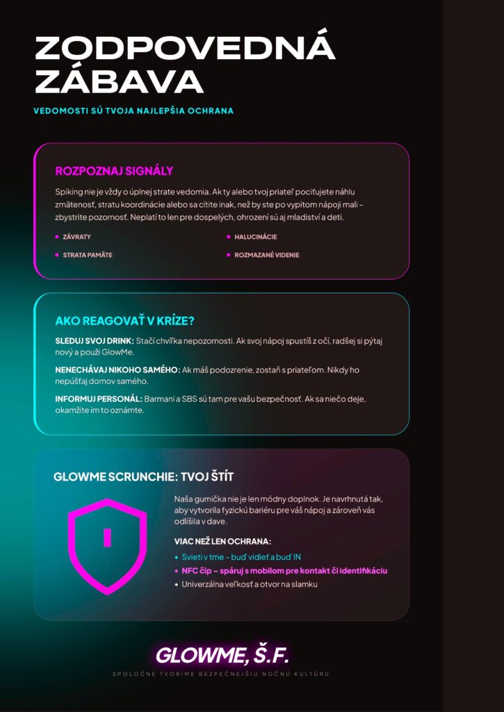 - GLOWME je svietiaca gumička s krytom a so slamkou. Tvoj drink bude odteraz vždy v bezpečí. Súčasťou je aj NFC čip, ktorý pomáha detekovať VÁŠ pohár. Štýl, svetlo a istota v jednom.